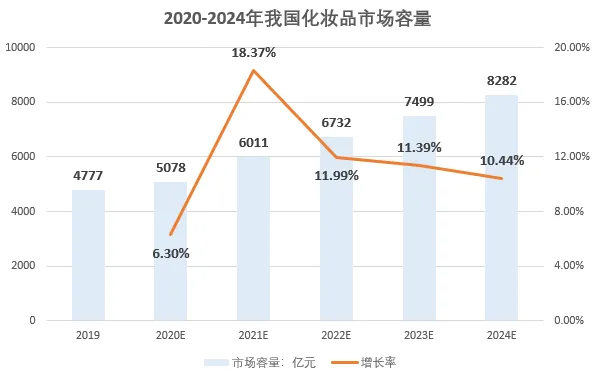 根据欧睿的预计,我国化妆品行业2024年市场容量将达到8282亿元,2019 年至 2024 年年均复合增长率约 11.6%