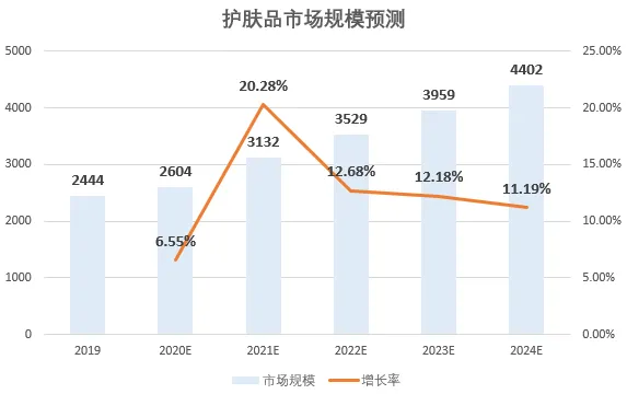 而护肤品作为化妆品规模最大的子行业,预计2024年市场规模将达到4402亿元,复合增长率为12.5%。
