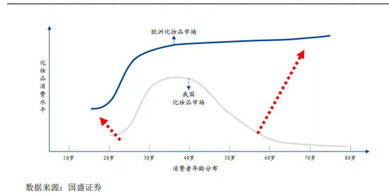 我国化妆品主力消费人群集中在22-25岁左右,相较于欧美国家,消费人群年龄结构仍相对较为集中。