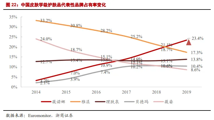 2019年我国皮肤学级护肤品,主要是由“薇诺娜”、“雅漾”、“理肤泉”三个品牌,占据主要市场份额。