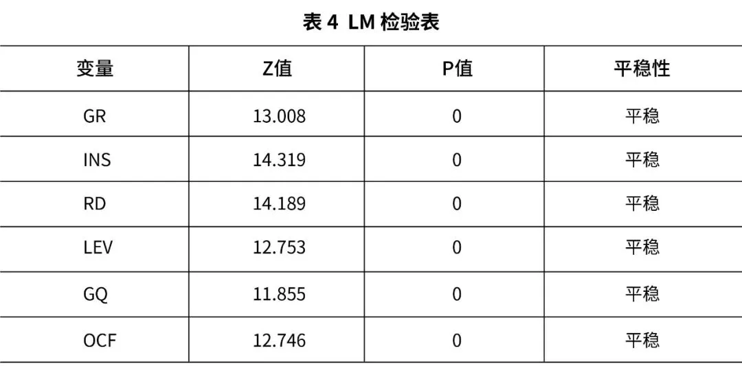 在构建模型之前,需要识别出相应的模型,确保模型参数估计的精确定义及可靠性,通常需要进行F检验与Hausman检验,以进行模型的确认。F检验原假设为:H0:αi=α。拒绝该假设,模型具有个体效应,属于个体效应模型。接受该假设,模型为混合效应模型,不需要进行相应的回归。Hausman检验原假设为:H0:模型个体效应和回归变量无关系。拒绝该假设,属于个体固定模型。接受该假设,为个体随机效应模型。检验结果如表2所示。检验通过Hausman检验,故本文建议选择个体固定效应模型。本文对2011—2020年320家高新技术企业的相关数据进行描述性统计,具体结果如表3所示。通过以上内容的分析可以看出,这次实证分析总样本为320个,被解释变量GR平均值为0.343,标准差为0.52,离散程度在各变量中比较低。从政府总补助量INS来看,最大值是 2.375,最小值是0.01,均值是0.279,标准差是0.131,出现这种现象主要是由于政府补助对不同规模公司的标准具有较大的区别,也许是和公司本身的个性化特征相关。从公司R&D投入的视角来看,最大值是2.515,最小值是0.03,均值是0.509,证明R&D投入能力上具有显著的差别,公司在享受政府补助期间,一般会付出财力以及人力,但是从实践活动可以看出,企业发展水平以及规模存在很大的差异,研发的项目也有区别,需要投入的资金不同。另外,各研发活动受到研发进度、市场因素和将来价值等要素的干扰,各公司的R&D投入大小显著不同。模型中经济变量是2011—2020年的一组时间序列变量,如果在回归分析过程中出现了伪回归的情况,自然会影响结果的准确度以及可靠性。为了有效规避出现伪回归的情况,需要对获取的数据进行单位根检验。面板数据在进行单位根检验的过程中,通常需要20年以上的时间序列长度,而本文选取的时间仅有10年,时间跨度比较小。面板单位根检验说服性不足,但是对于短时间面板单位根验证避免伪回归具有一定的参考价值,所以,应该做单位根验证,应用比较广泛的单位根检验方法有LLC检验、LM检验、ADF检验、PP检验。本文采取LM检验,分别对各个变量进行检验,具体结果如表4所示。从表4中可以得到各个变量的Z值、P值以及平稳性。所有变量在1%的置信水平下P值均为0, 则表明这些变量均通过了单位根检验,表明数据是相对平稳的。1. 政府补助对R&D投入影响的回归分析