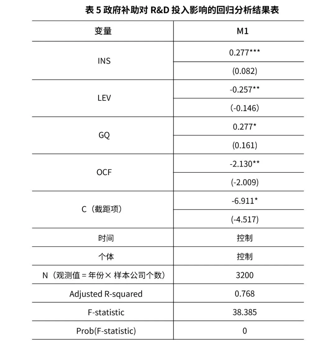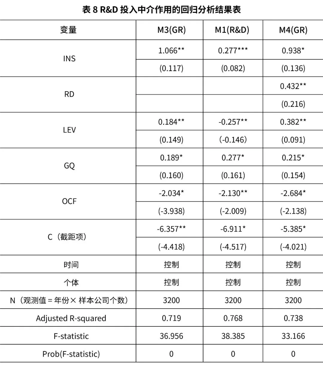 GRit=a0+a1INSit+a2LEVit+a3GQit+a4OCFit+eit其中i为企业数量(i =1…320),t为时间变量(t =1…10),a为系数,εit为模型误差。- 4.为检验 R&D 投入的中介作用关系,构造如下模型 M4: