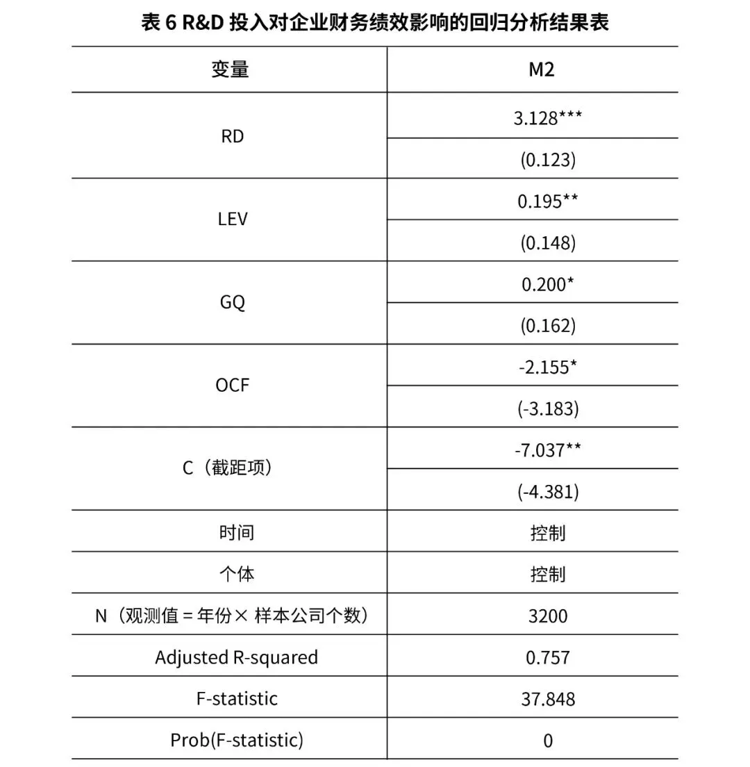 通过表5可知,政府补助的回归系数为0.277,在1%的显著性水平下与企业R&D投入存在显著的正向关系,说明政府补助推动了高新技术企业的R&D投入,假设H1得到验证。通过模型的分析可以看出,模型的拟合度为0.768,意味着自变量在76.8% 的程度上解释了高新技术企业R&D投入。模型的F值是38.385,符合了1%的显著性验证,这也证明了此模型是有效的,能够开展下一步的分析。2. R&D投入对企业财务绩效影响的回归分析