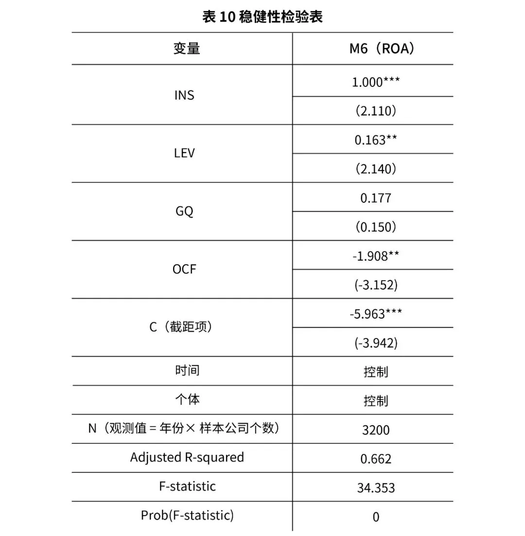 为了将高新技术企业与传统企业进行对比分析,本文额外选取了120家上市传统企业2011-2020年的企业数据作为研究样本,构建回归模型对比如表9。注:*、**、*** 所代表的显著性水平分别为10%、5%、1%,括号内的数字代表t值通过表9的分析可知,政府补助对于传统企业财务绩效的影响系数为0.352,而在高新技术企业中则达到1.066,两者都在10%的水平上通过了显著性检验。说明与传统企业相比,政府补助对高新技术企业财务绩效的作用更加明显。从控制变量上能够发现,和高新技术公司对比,资产负债率与股权集中度对于传统企业的财务绩效影响更加明显。模型M3和模型M5的F值分别为36.956和33.984,都通了1%的显著性检验,意味着该模型有效,假设H5成立。6. 模型稳健性检验