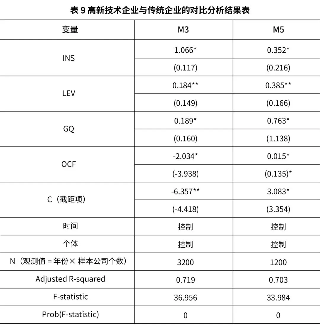 为验证在政府补助对公司财务绩效影响中R&D投入的中介作用关系,按照前文的模型筛选和验证结果,回归结果如表8:注:*、**、*** 所代表的显著性水平分别为10%、5%、1%,括号内的数字代表t值通过以上内容的分析可知,将R&D投入当作是中介变量纳入到模型中以后,政府补助的系数为0.938,且在10%的程度上通过了显著性检验,则根据温忠麟(2005)的验证流程,可得 R&D投入发挥中介效应,即假设H4成立,且中介效应为部分中介效应。5. 高新技术企业与传统企业的对比分析