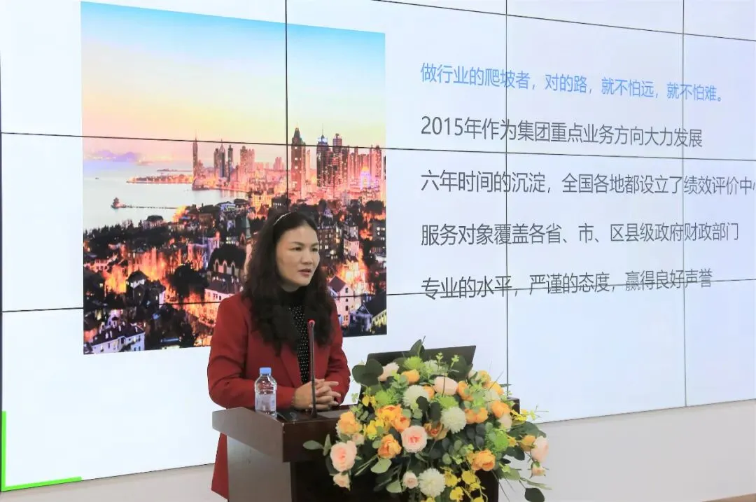 随后,国众联广州分公司董事长办公室程艳副主任从绩效评价中心概况、业务开展、服务部门与发展愿景向与会人员介绍国众联绩效评价中心。绩效评价中心负责绩效评价业务的管理和运营,组织学术交流研讨、专家库管理、数据库建设(数据挖掘、分析与应用)、绩效业务研究、业务模型建设以及对外宣传与培训。程艳认为,绩效评价中心的建立,不仅建立了数据库供参考学习,也有利于对外的展示,树立专业形象和良好的口碑。
