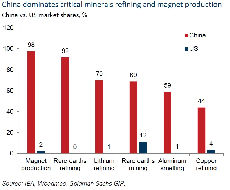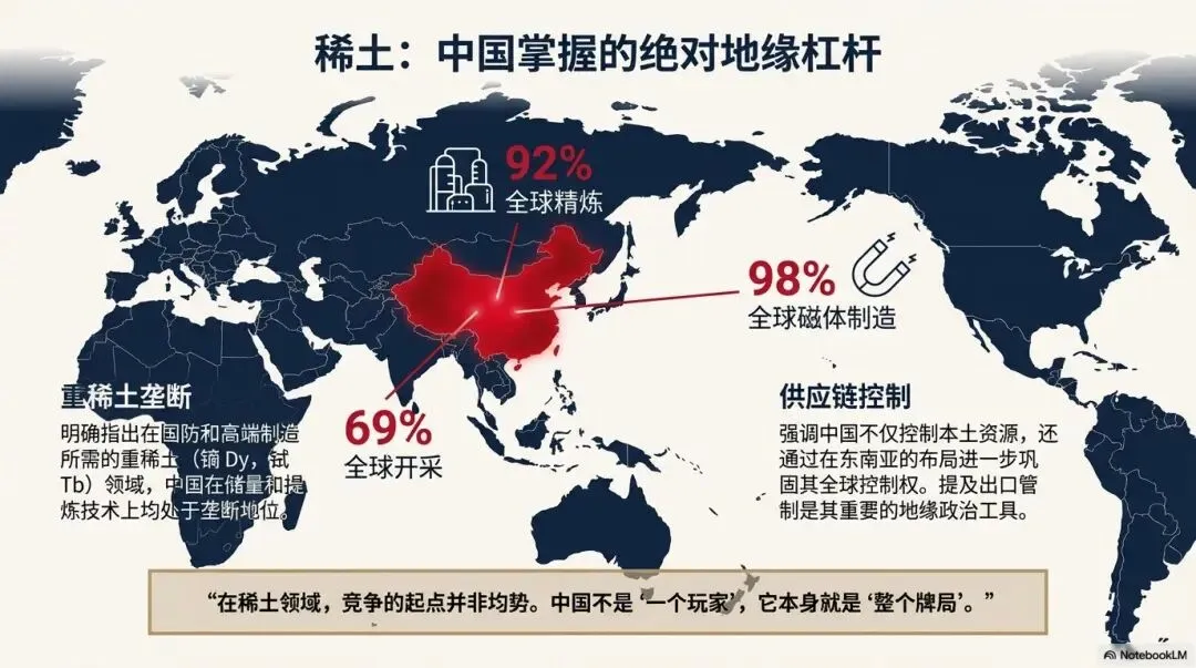 重稀土(镝、铽)领域,储量和提炼技术均处于垄断地位,且通过在东南亚布局进一步巩固控制权。