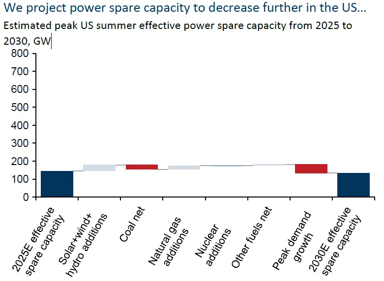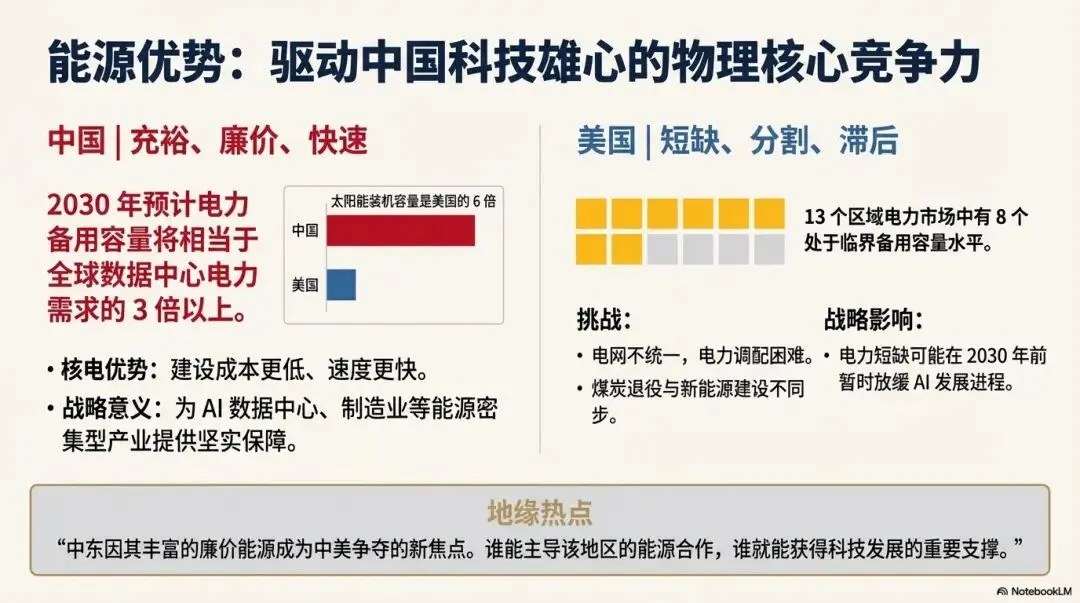 ,2030 年预计备用容量相当于全球数据中心电力需求的 3 倍以上;太阳能装机容量是美国的 6 倍,核电建设成本更低、速度更快,为 AI 数据中心、制造业等能源密集型科技领域提供保障。