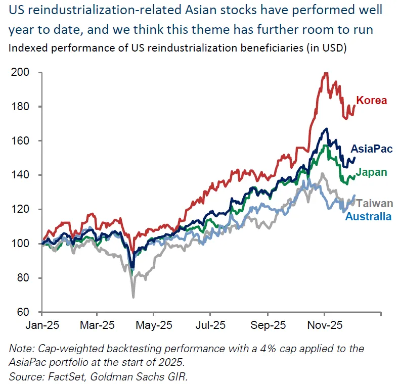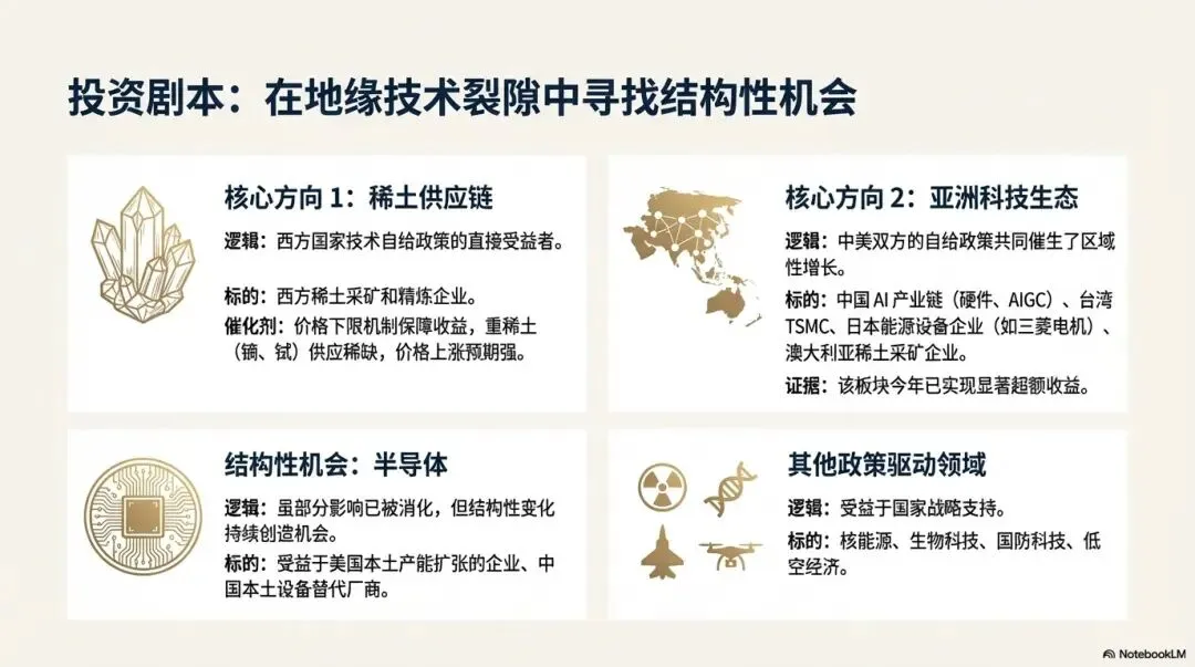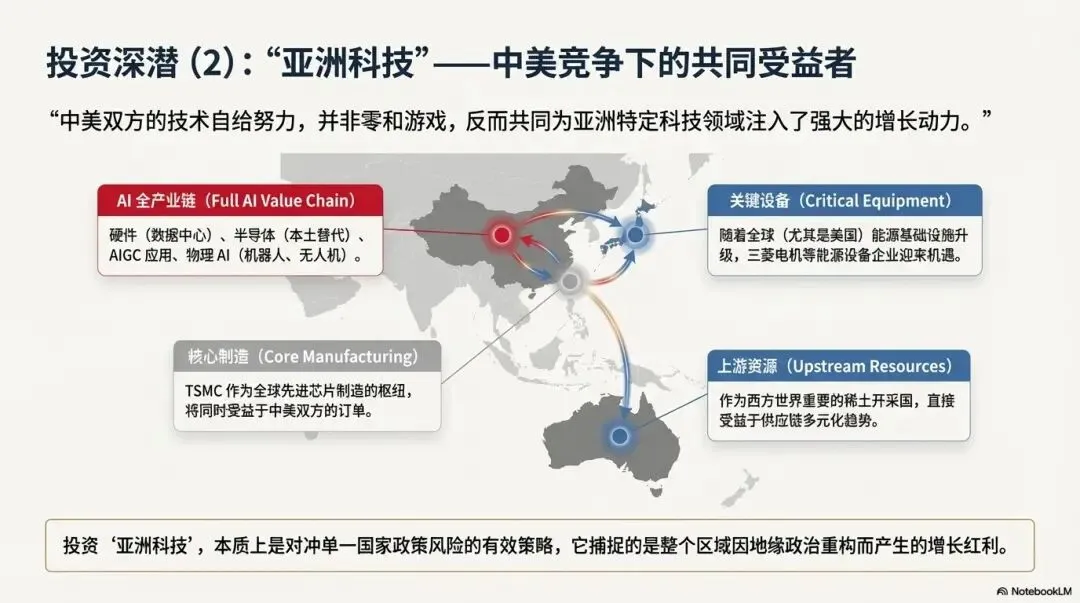 东大 AI 产业链(硬件、半导体、AIGC 应用、物理 AI)、台湾 TSMC、日本三菱电机等能源设备企业、澳大利亚稀土采矿企业均受益于中美双方的技术自给推进,该板块今年已实现显著超额收益。