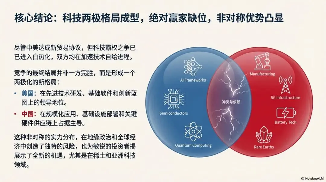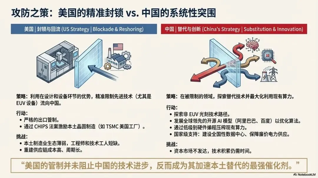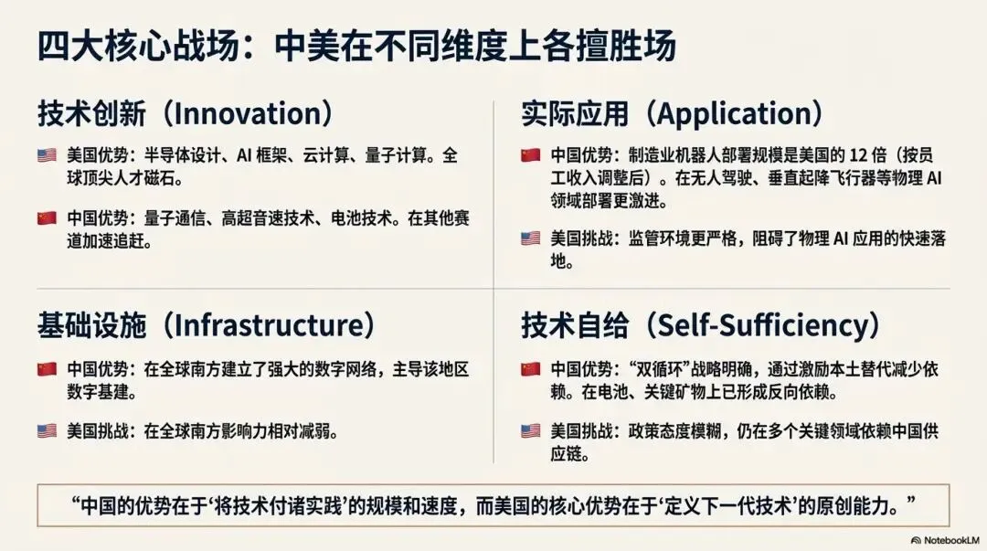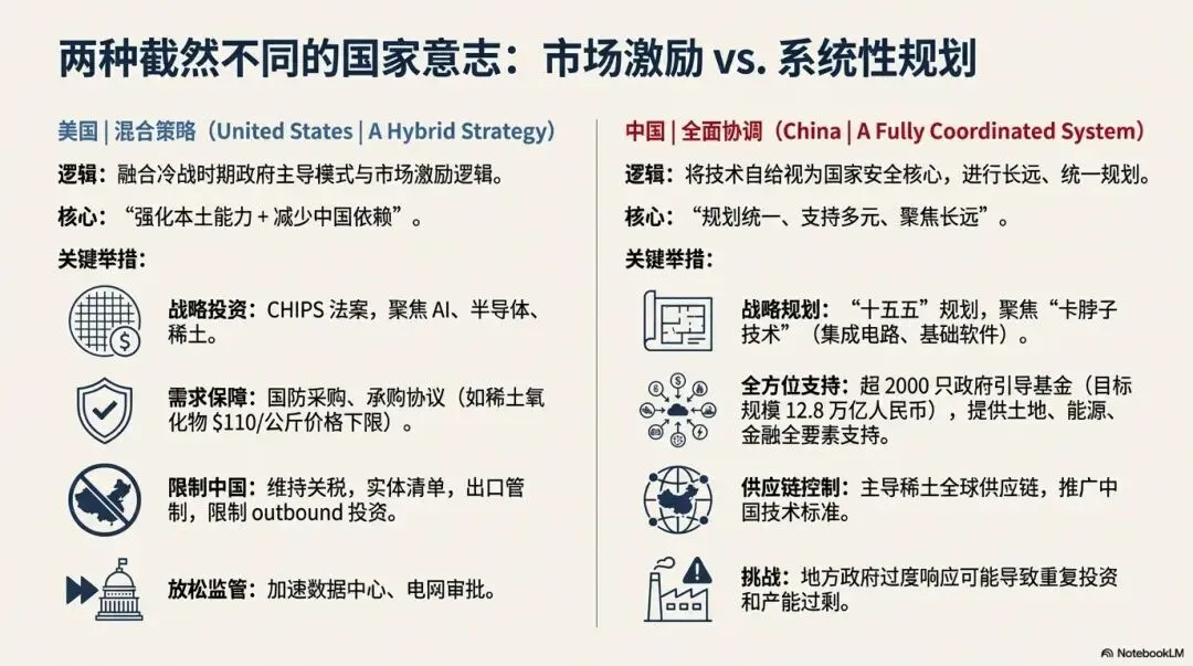 ,双方均推进技术自给政策,美国在先进技术研发领先,东大在应用、基础设施部署和关键供应链占优,