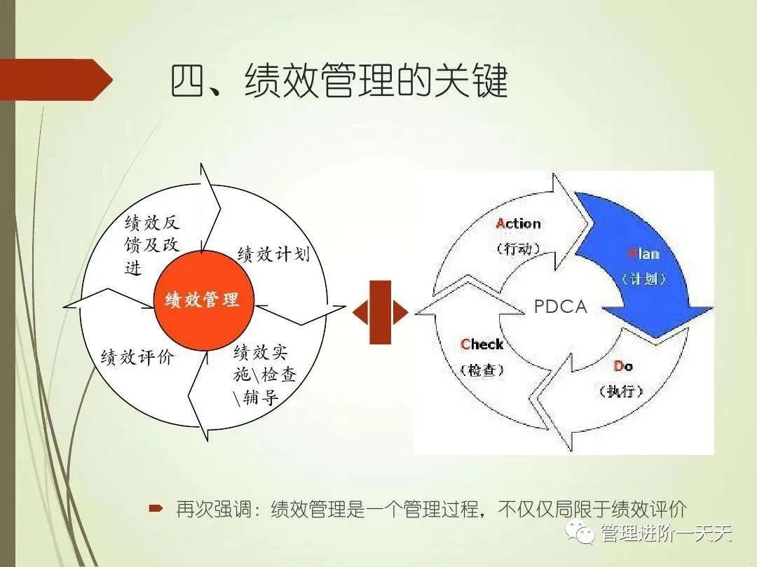 绩效管理的重点不在绩效考核,而在于绩效经营和绩效改善,它注重的是过程,通过过程来控制结果。这就和管理的戴明环类似,通过绩效经营获得绩效改善,使组织不断改进,不断完善。它通过管理者与下属一起制定双方认可的绩效目标,统一绩效考核的标准规范,明确完成绩效目标所需的能力,来实现员工过程管理。尤其是员工能力,这也是绩效考核的一个关键,在实现绩效考核目标的同时,员工能力获得成长,这是双赢的结果,容易获得推行。