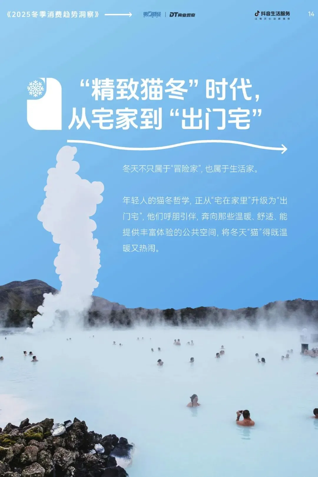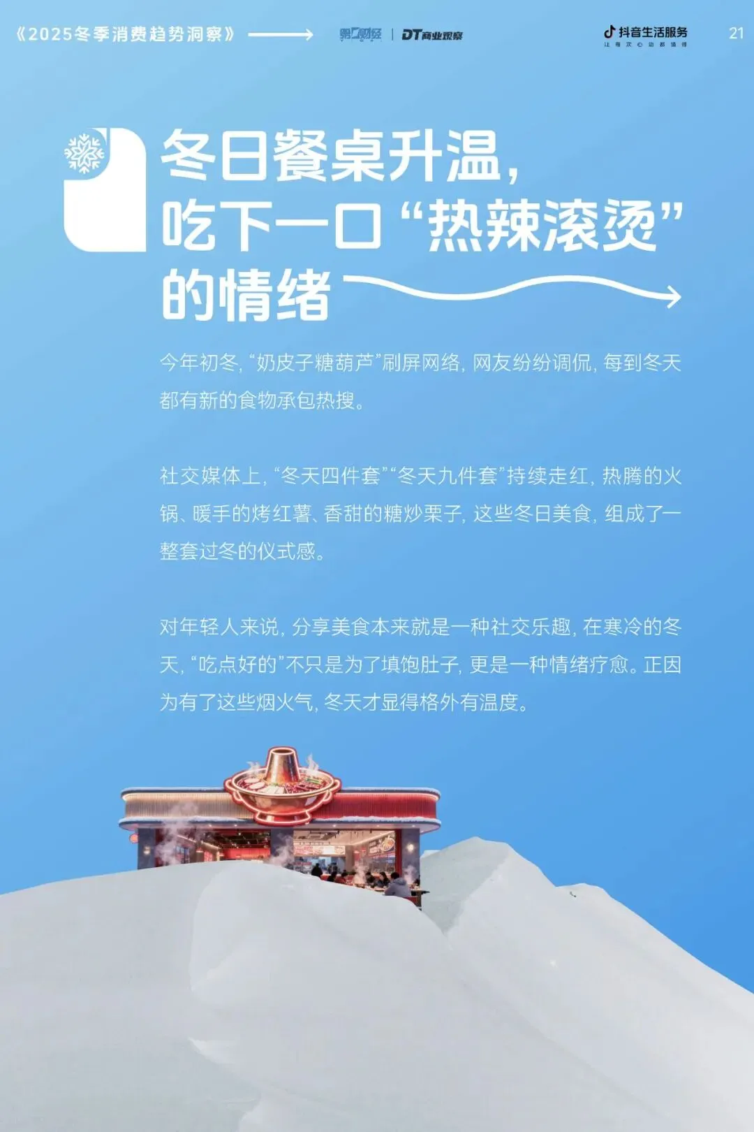 哈尔滨初雪刷屏社交圈,“南方小土豆”带着行李箱再启北上之旅。当全国气温集体“跳水”,消费市场却逆势升温,跑出了加速度。从冰雪场上的飞驰身影,到洗浴中心的松弛躺平,再到餐桌边的热辣蒸腾,冬季消费早已跳出“御寒刚需”的老框架,成为人们表达生活态度的新载体。
