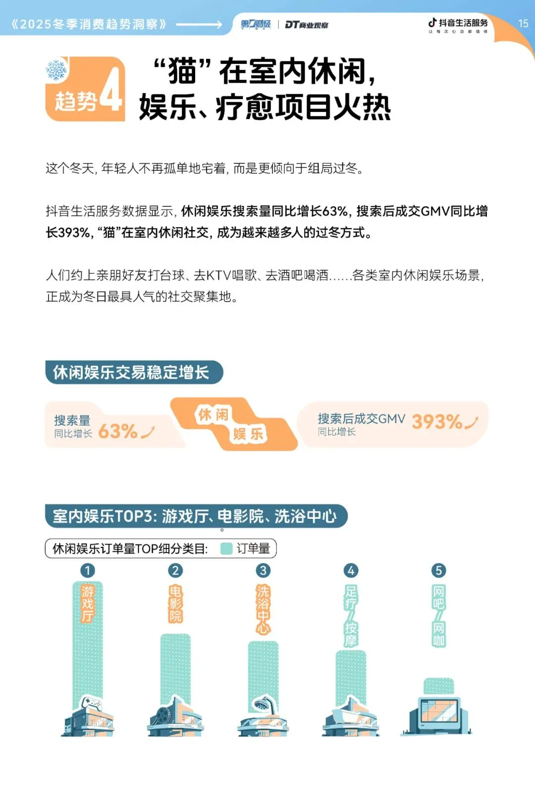 室内休闲娱乐的订单数据,清晰地反映出这个冬天的消费偏好。游戏厅、电影院、洗浴中心稳居订单量前三,全方位满足人们放松身体、愉悦精神的需求。