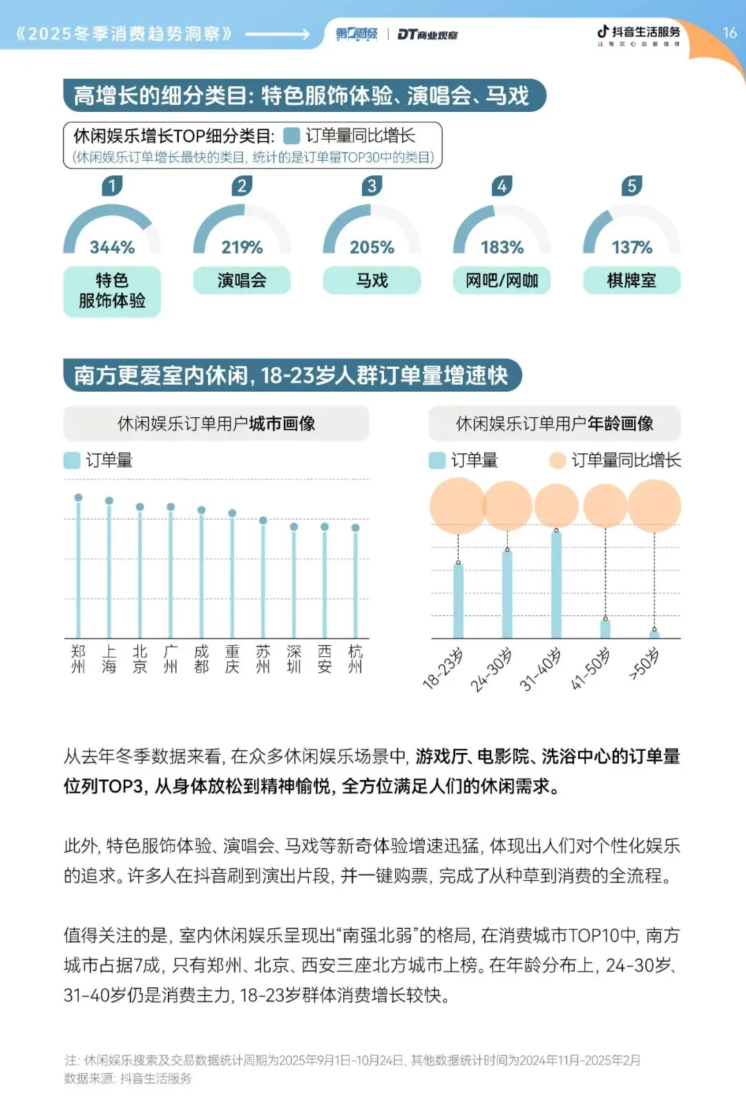 从地域分布看,室内休闲娱乐呈现“南强北弱”的格局。消费城市TOP10中,南方城市占了7成,上海、广州、成都、重庆等城市领跑。这和南北方的气候差异密切相关,南方冬季湿冷,室内大多没有集中供暖,让人们更愿意走出家门,在恒温的商场、场馆里社交娱乐。