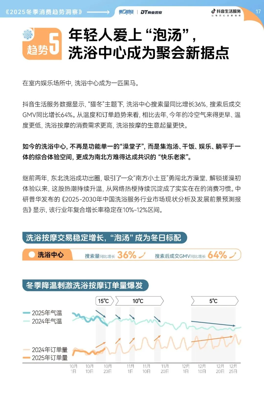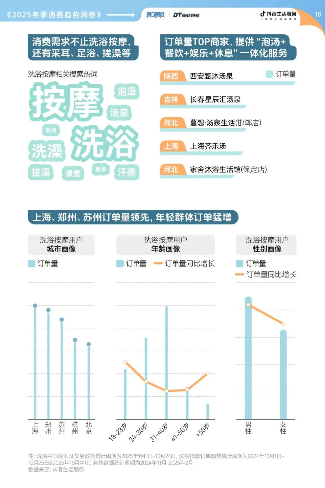 在众多室内娱乐场所中,洗浴中心成了最大黑马。数据显示,“猫冬”主题下,洗浴中心的搜索量同比增长36%,搜索后成交GMV增长64%。随着今年冷空气提前降临,洗浴按摩的消费需求也比去年更早爆发,订单量显著提升。