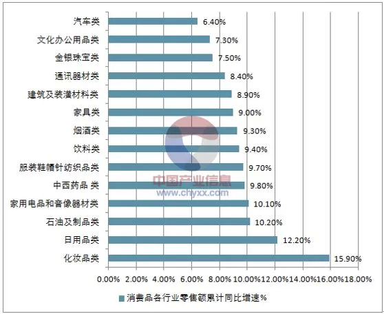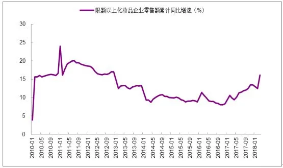 (1)从限额以上消费品各行业来看, 2018年4月份化妆品类零售额累计同比增速达到15.90%,增速最高,领跑其他消费品类;