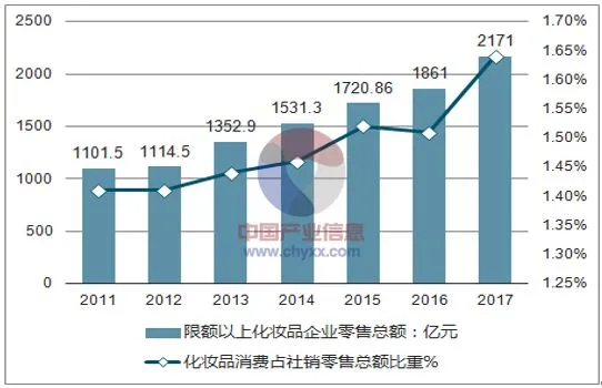 (2)2017年限额以上化妆品行业全年零售额达到2171亿元,同比增长 16.66%, 增速为2013年以来新高,高于同期消费品社零增速(+7.56%);