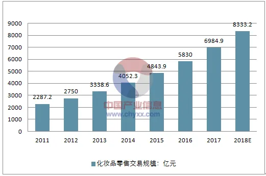 (4)从整体零售口径统计来看,2016年中国化妆品零售整体交易规模达到了5830亿元,增长率达到20.4%,预计到2018年,这一规模将超过8000亿元。