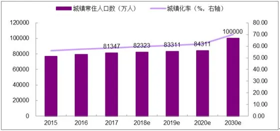 城镇人口方面, 2017年末,国内城镇常住人口 81347 万人, 城镇化率达到 58.52%, 平均每年增长 1.2%。预测2030 年,中国城镇化水平将达到 70%,届时中国城镇人口总数将超过 10 亿。
