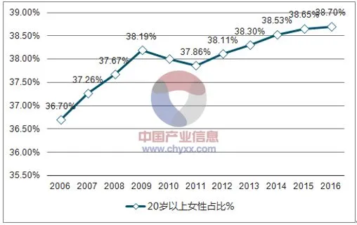 人口结构方面,2006-2016年中国20岁以上女性人口比例在36.6%-38.7%之间波动,占比相对稳定,变动趋缓,整体取10年算数平均数38.00%假定为20岁以上女性稳定比例。收入方面,2017年全国居民年人均可支配收入中位数22408元,按全国居民五等份收入分组进行估算, 年人均可支配收入3万元以上人口约占37.55%。