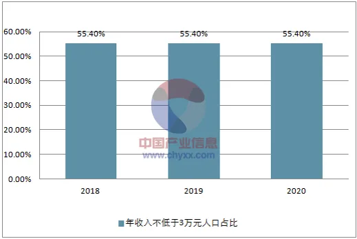 由于核心化妆品人群消费较人均水平略高, 且参考《女性生活蓝皮书(2016)》城市女性个人年收入平均8.42万元, 设定在20岁以上城镇女性中,年收入不低于3万元人口占比为55.4%。