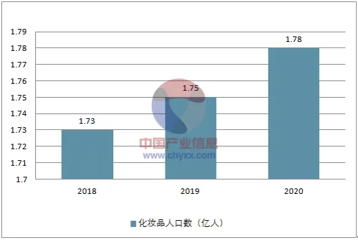 由“化妆品人口数=城镇人口数×20岁以上女性比例×年收入不低于3万元人口占比”计算得出,2017年中国化妆品人口数大约为1.71亿人,2018年达到1.73亿人, 2020年将超过1.75亿人。