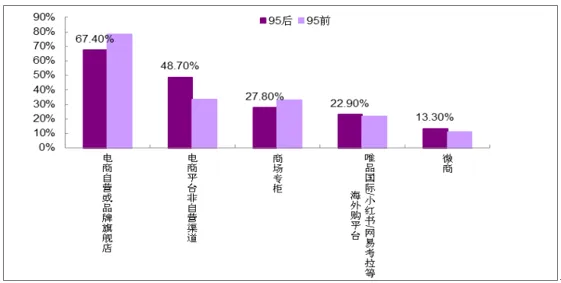 白领及大学生是化妆品时尚消费主流人群,网购是主要消费渠道。白领和学生拥有稳定的收入,追求新鲜时尚的事物,注重性价比,消费习惯偏向线上,网购占比达到58.5%。线上渠道方面,电商自营或者品牌旗舰店(如唯品会、京东、天猫等)是95后选购美妆产品的主要渠道,所占比重接近7成。相对于其他年龄段,95后对商场专柜、服装零售市场等渠道的偏好更低,网络化程度更高