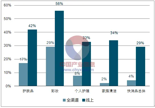 护肤品占比过半,彩妆市场增速最快。护肤品单个品类占整个化妆品市场规模的51%,随消费者对自身享受消费提高,预计护肤品市场规模会持续上升;另外,不管是从全渠道还是线上渠道来看,彩妆消费金额增速稳居化妆品类榜首,2017年全渠道销售增速接近30%,大幅超越护肤品(+17%)、个人护理(+7.7%)、家庭清洁(+2.3%)以及快消品总体增速(+4.3%)。