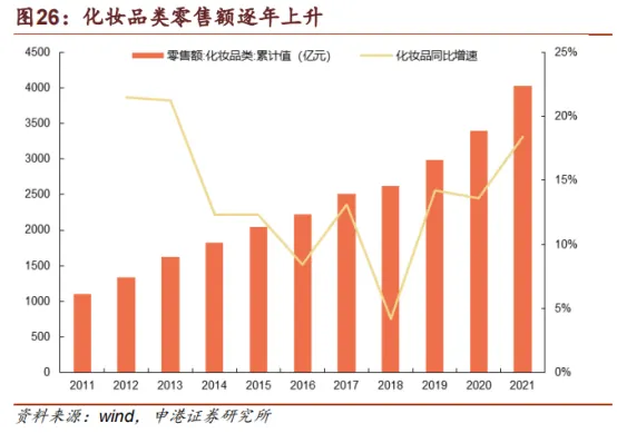 年,基本保持两位数的较高速增长,总体上来说化妆品整个行业的增长速度还是相当不错的。