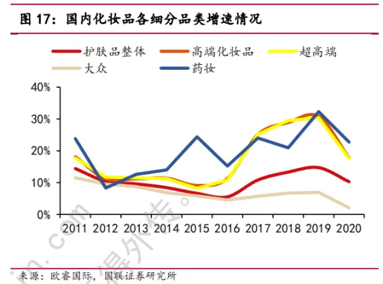 再来对比下国内化妆品各细分品类增速情况:近几年增速较快的高端、超高端、药妆;高端、超高端增速较快跟消费升级有很大的关系,现在大多数产品都呈高端化发展,白酒、啤酒、家电都是如此。