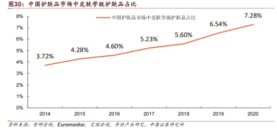 所以在国内护肤品市场中皮肤学级护肤品增速较快,过去几年皮肤学级护肤品占比护肤品市场从