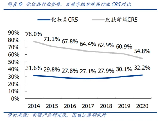 ,代表着市场集中度非常高,意味着竞争壁垒较高,行业里产生了领导者,竞争烈度较为温和。但皮肤学级