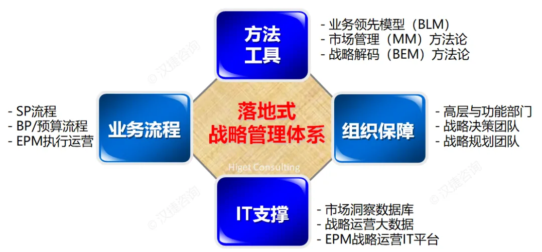 汉捷帮助企业建立“方法、流程、组织、IT”四位一体的落地式DSTE体系