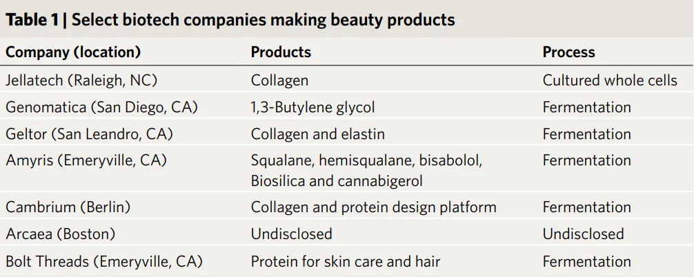 选择生产化妆品产品的生物技术公司(来源:Nature Biotechnology)