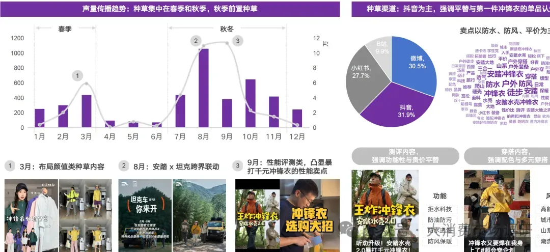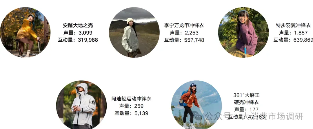 运动品牌冲锋衣主力单品声量表现:安踏大地之壳种草热度最高