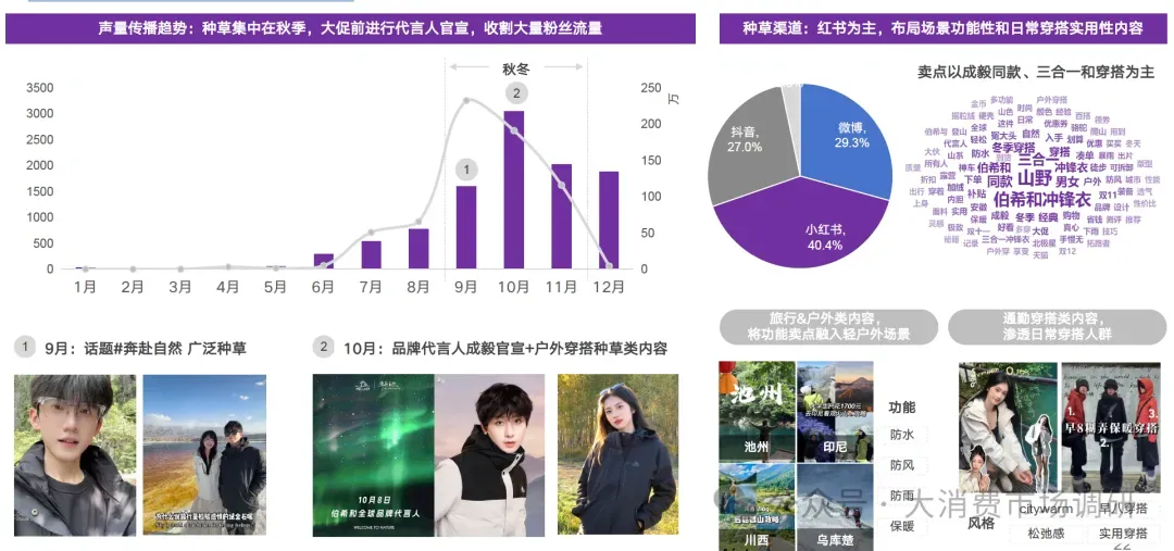 伯希和山野以代言人撬动流量爆发,通过户外场景和通勤穿搭类内容,向轻户外与日常穿搭人群渗透