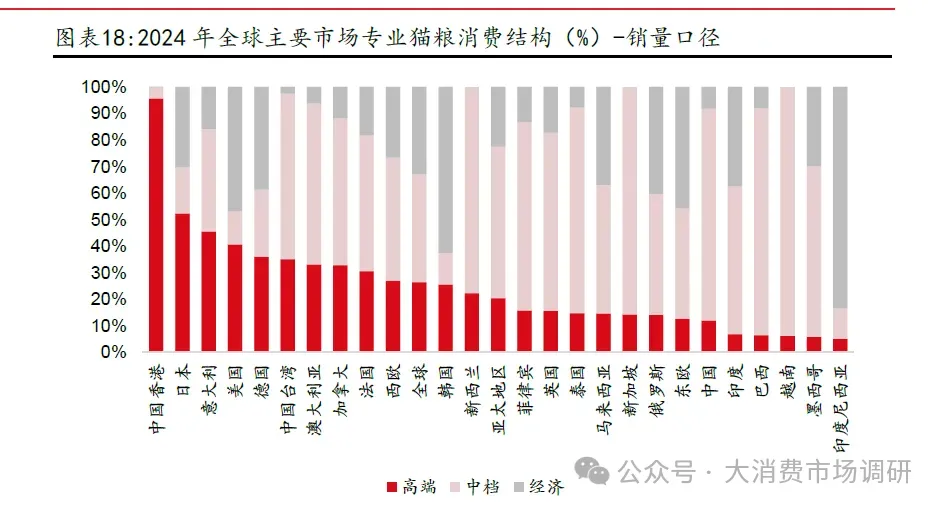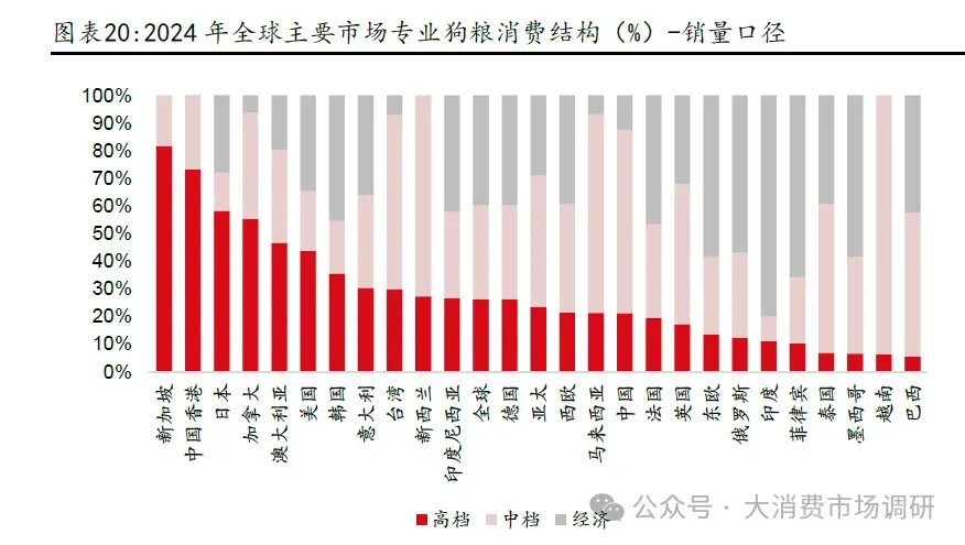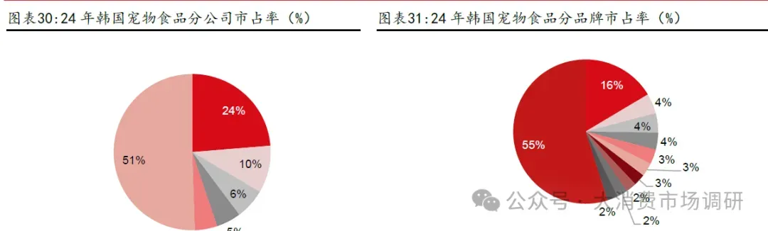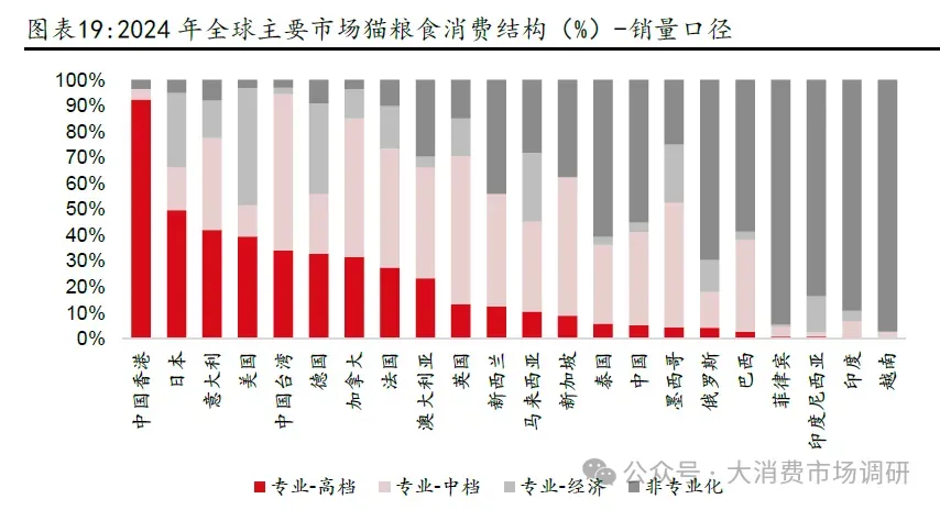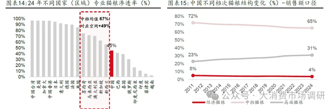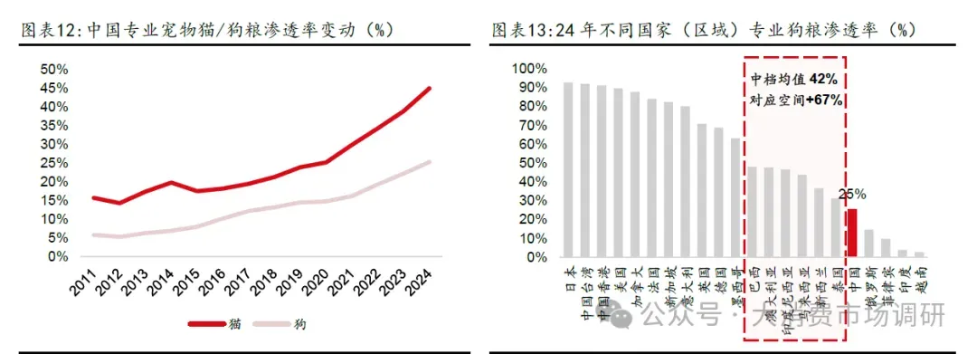 2011-2024 年,专业猫/狗粮渗透率分别提升29/20pcts。从渗透率提升速率上看,提升速率有所加速,12-21 年(合计10 年)专业猫粮/狗粮渗透率分别平均每年提升1pcts/1pcts,22-24 年(合计3 年)专业猫粮/狗粮渗透率分别平均每年提升5pcts/3pcts。2024 年中国专业宠物猫/狗粮渗透率分别为45%/25%。横向对比看,当前中国专业宠物粮渗透率与其他成熟市场仍有较大差距,处于全球主要国家(区域)专业狗/猫粮渗透率中下游区间,分别相较专业狗粮/猫粮渗透率中档均值还有67%/49%的空间。