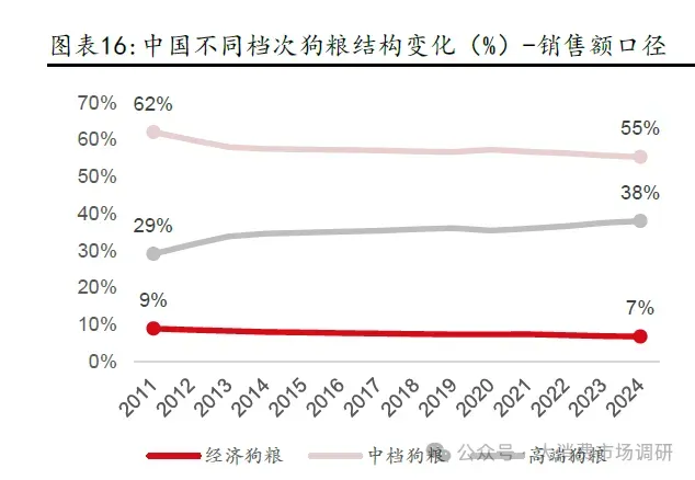 销售额口径下,2011-2024 年中国高端猫粮占比从23%提升至31%(+8pcts),高端狗粮占比从29%提升至38%(+9pcts)。横向对比看,当前中国宠粮结构仍较低,2024年专业猫/狗粮销量口径下,高端猫粮/狗粮占比分别为12%/21%,低于全球&亚太区域数据均值(高端猫粮占比分别为26%/20%;高端狗粮占比分别为26%/23%)。