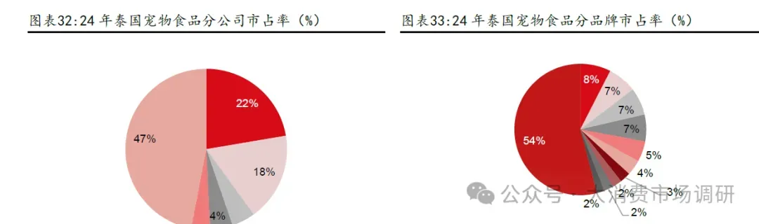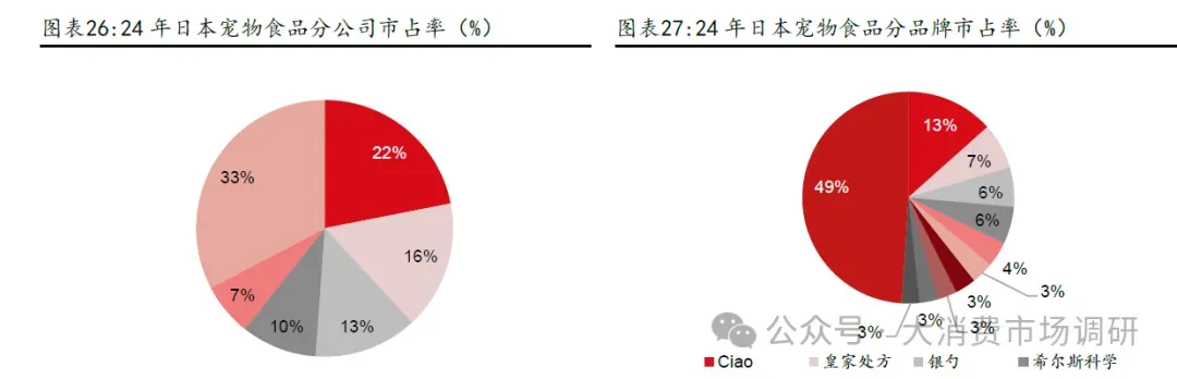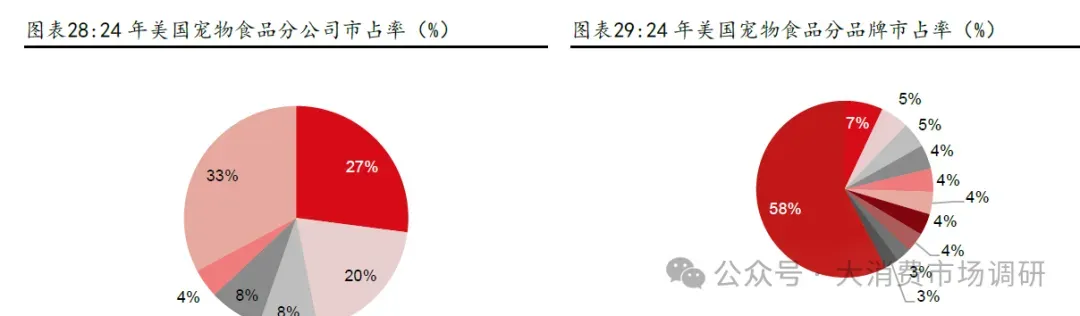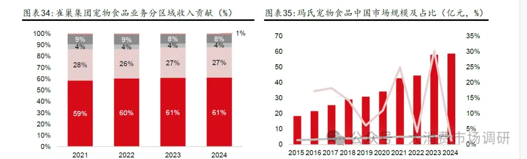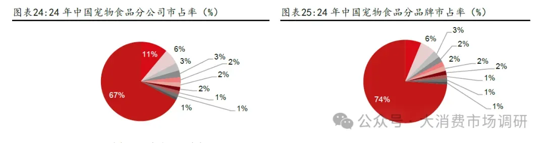 外资品牌占比下滑主要系:1)外资品牌在线下渠道优势更强,但不注重线上营销。中国宠物食品行业渠道结构上以电商占比为主,营销在消费者决策中起到关键作用;2)产品重心在精细化方面,与国内“高蛋白、高鲜肉”等需求存在差异,且外资品牌产品创新不足,对比国产品牌在产品端快速迭代。外资宠物主粮分类更为细致,在年龄结构方面,区分了幼年宠物、成年宠物、老年宠物;在宠物品种方面也做了细致区分,推出了品种粮等;在功能性、处方粮方面布局也较为完善。在国内消费者更追求“高蛋白、高鲜肉”的背景下,外资品牌在产品方面的创新动力不足。一方面,中国宠物市场收入贡献小,外资品牌对中国市场重视程度不足,没有为中国市场推出更适合的产品。根据雀巢财报,24 年中国区域宠物食品仅占全球宠物食品业务的0.7%,收入贡献为1.26 亿法郎,11.30 亿人民币(同比-2.0%,21-24 年CAGR 仅为4.0%)。玛氏的情况也类似,根据欧睿国际数据,玛氏集团24 年中国区域猫狗食品仅占全球宠物食品业务的2.7%。外资品牌在中国市场售卖的产品和国际市场相同,由于收入占比低,没有动力为中国市场推出产品,迎合中国宠物主消费偏好。另一方面,国外品牌研发新品的审核流程相对较长,通常是委托国内代理商进行分销,获取消费者反馈的流程比较滞后。而中国品牌借助电商测款,可以迅速捕捉市场需求变化,做到快速产品迭代,批量产出爆款。