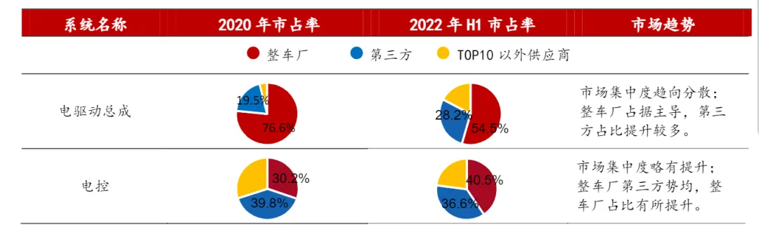 大三电市场集中度相对分散,未来竞争格局尚不清晰。随着新能源汽车渗透率持续提升,较多企业涌入大三电市场,行业竞争日趋激烈。根据 NE 时代的数据,对比 2020 年和 2022 年 H1 国内市场占有率数据,电驱动总成市场集中度趋向分散,整车厂虽然占据主导,第三方占比快速提升 9 个百分点;电控市场集中度略有提升,整车厂第三方势均,整车厂占比提升 10 个百分点;电机市场集中度趋向分散,整车厂第三方势均,整车厂占比提升 4 个百分点;减速器市场集中度趋向分散,整车厂依然占据主导,但占比下降 3 个百分点。