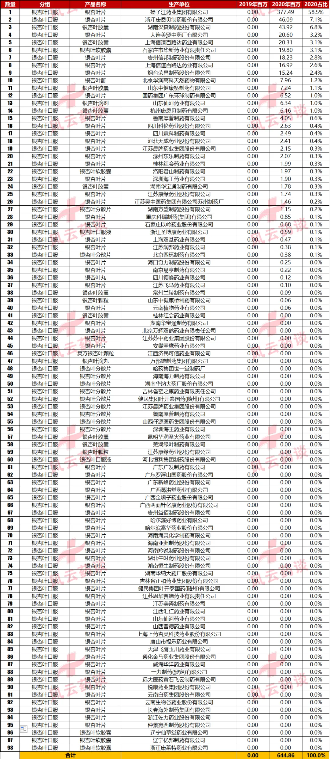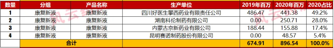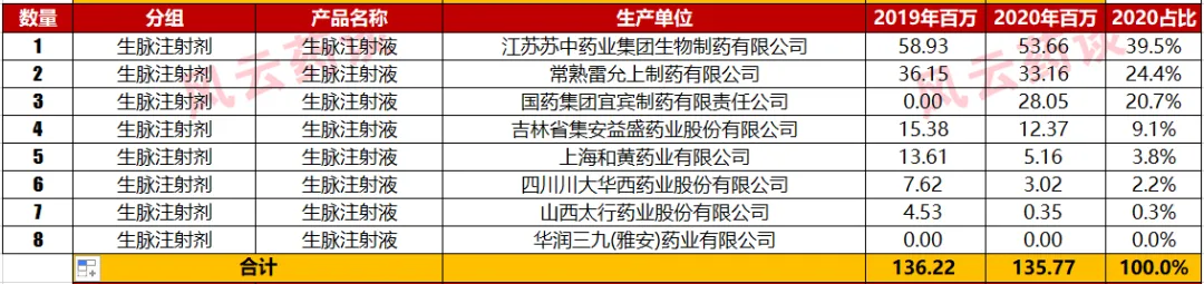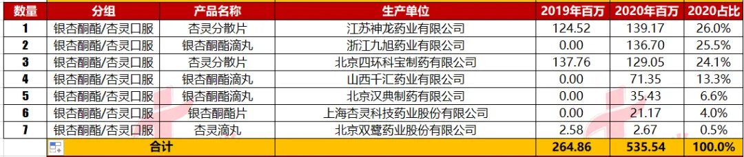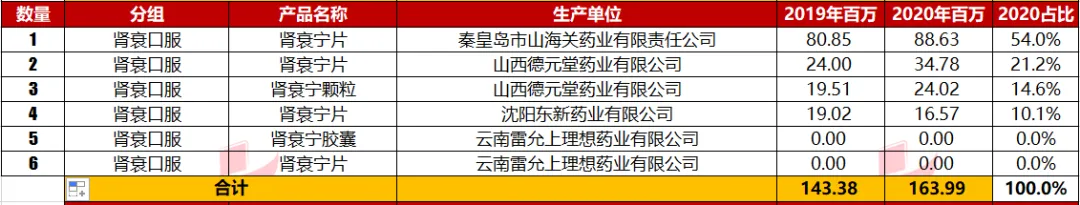 以上数据,包括产品对应分组的通用名,通用名对应的企业数量,企业对应的2020年销售金额仅为数据库查询整理。