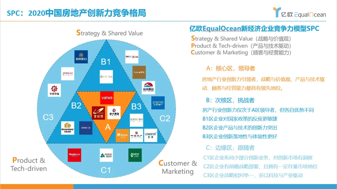 根据亿欧新经济企业竞争力模型SPC,我们构建了2020年中国房地产创新力竞争格局。S是战略与价值观,P是产品与技术驱动,C就是顾客与经营能力。根据SPC三大维度的评判,最终得出房地产创新力竞争格局。万科、碧桂园、恒大处于地产创新的核心引领地位,保利、融创、龙湖、金茂等紧随其后。