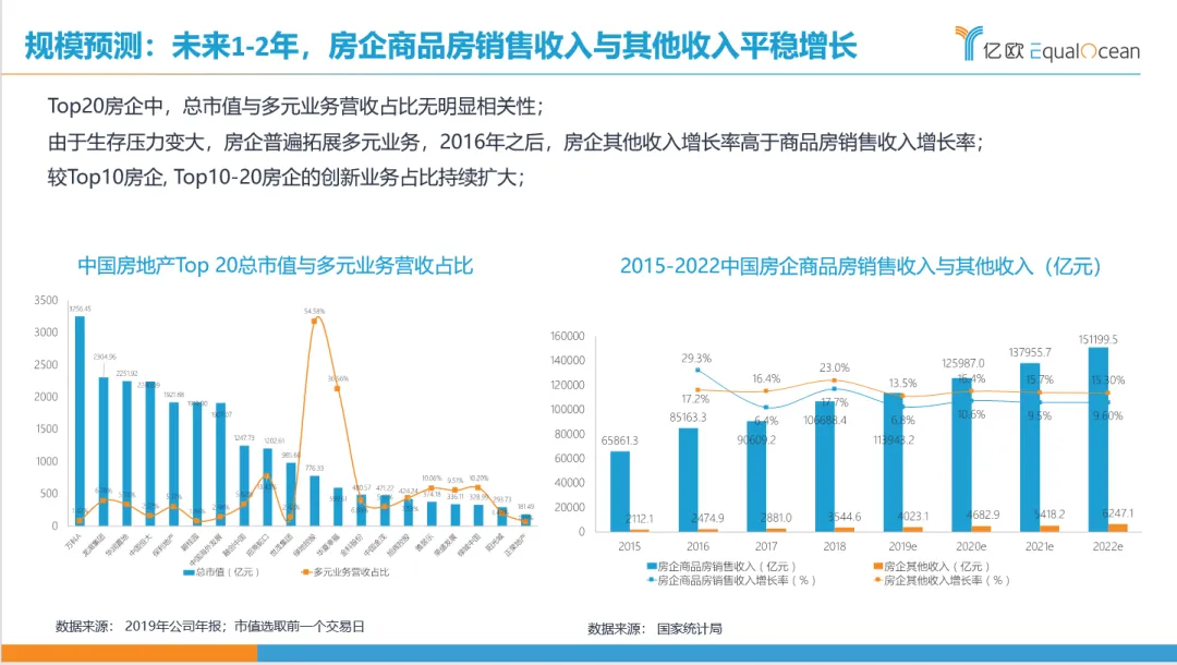 根据目前房地产行业发展态势,我们预测未来1-2年,房企商品房销售收入与其他收入平稳增长。另外,通过研究我们发现多元业务的营收占比与房地产企业的市值及未来营收之间并无明显的相关性,因为地产创新依然处于初期,所以因创新带来的影响还不会特别大,但之后随着各地产企业创新业务的发展,对地产企业的市值及营收的影响也逐渐增大。