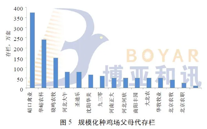 随着人们消费水平的提高,鸡蛋消费结构调整,下游对鸡蛋品种需求趋于多元化,致使种鸡品种需求多元化增强,粉壳、白壳鸡蛋市场份额有所增加。据峪口禽业数据显示,我国褐壳蛋需求占比58%,粉壳蛋占比40%,白壳蛋、绿壳蛋均为1%。国内自主育种品牌逐渐崛起,京红、京粉、农大3 号、农大5 号、新杨系列、大午粉、大午金凤等国产品种养殖户认可度明显提高。由于近年来鸡蛋价格波动较大,蛋鸡产业逐步调整,种鸡企业之间不断兼并整合,种鸡场数量大幅减少,集中度不断提高。据统计,目前调查的全国15 家种鸡企业父母代存栏量在全国占比高达65%,其中仅峪口禽业、华裕农科、晓鸣农牧3 家占比达35.95%。目前家庭式养殖(3 万~5 万羽)是未来养殖的主力军,同时自2015 年以来百万级蛋鸡养殖不断增加,规模化养殖成为趋势。随着规模化养殖程度的提高,为满足市场需求,种鸡场单批次供种能力增强(图5)。