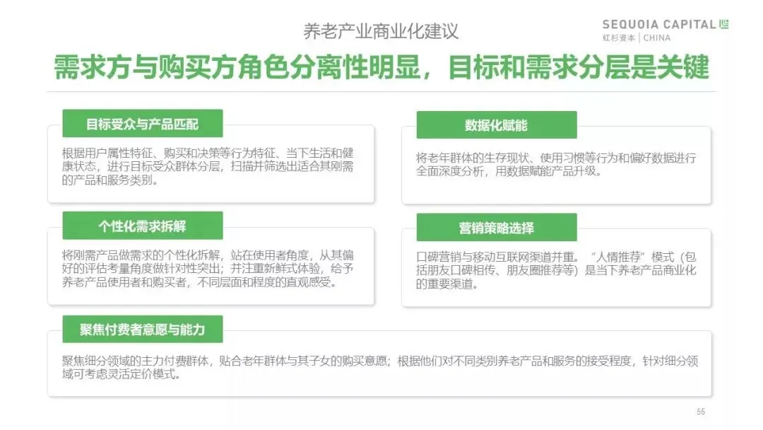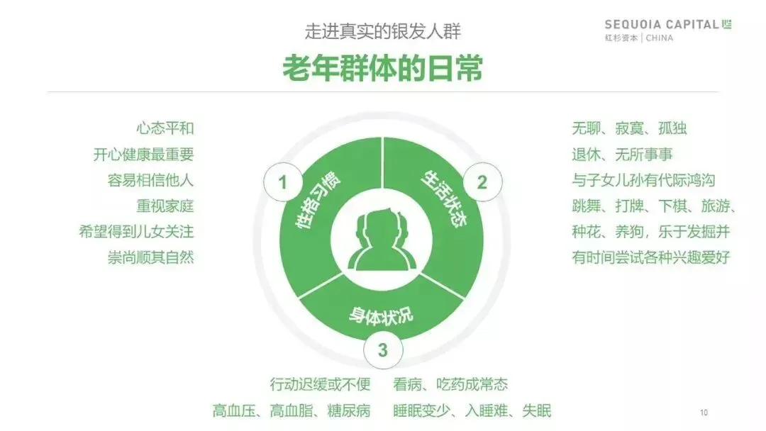 人口老龄化是中国社会少数几个具备确定性的结构性变化,已经在发生,而且会加速。这样重大的结构性变化必将对整个社会的方方面面都带来广泛而深刻的影响,因此非常有必要多维度、多层次、全方位地对此进行调查和研讨,从中寻找创新、创业和投资的机会。我们认为,在未来5到10年里,新需求、新供给、新业态、新商业模式将推动我国“银发经济”的蓬勃发展,我们期待和有志于此的创业者、从业者们共同努力,为数亿中国老年人创造幸福的美好生活!
