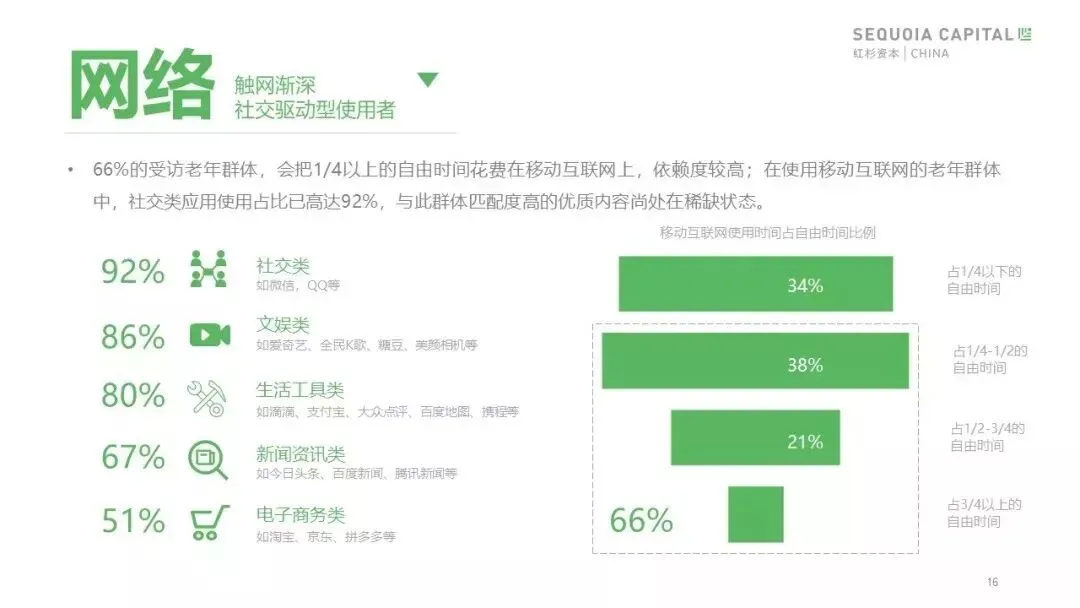 老年群体触网率高,对移动互联网依赖明显,网络行为围绕社交驱动