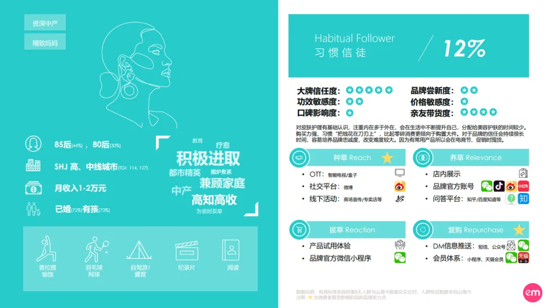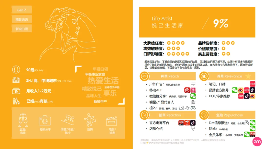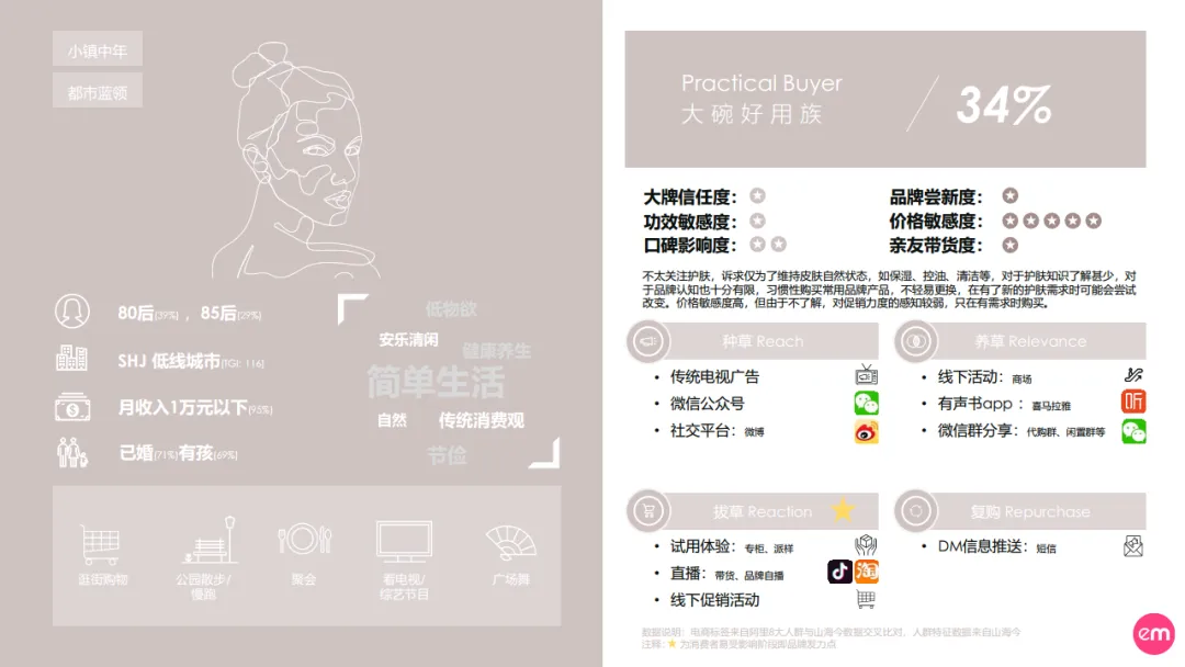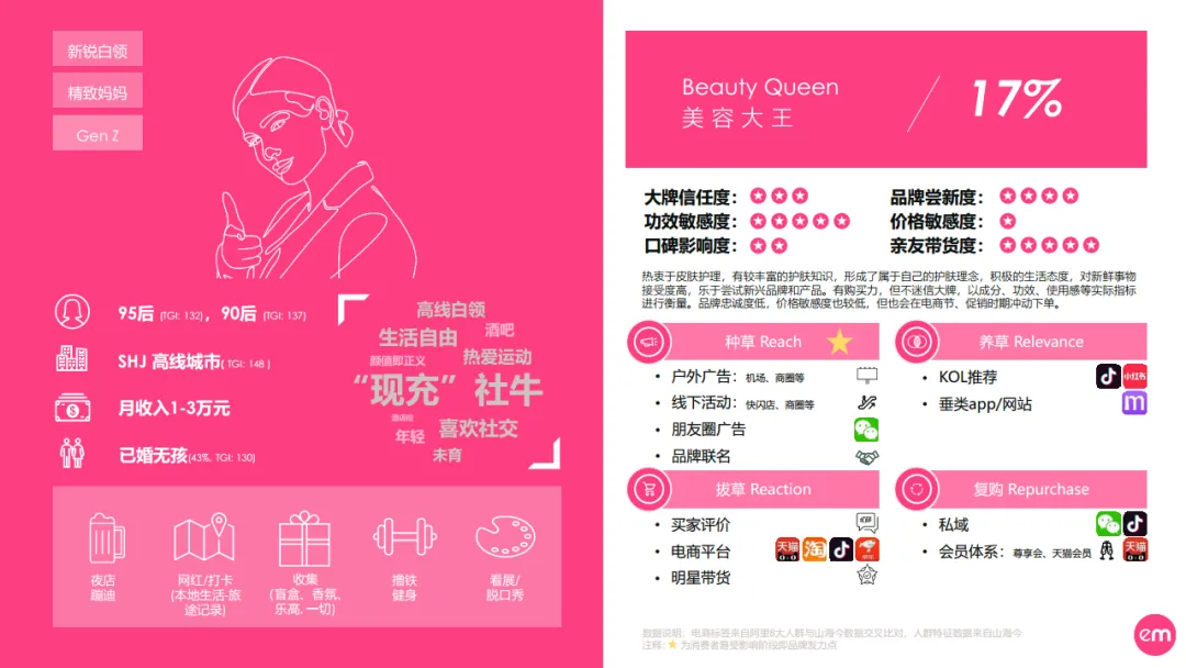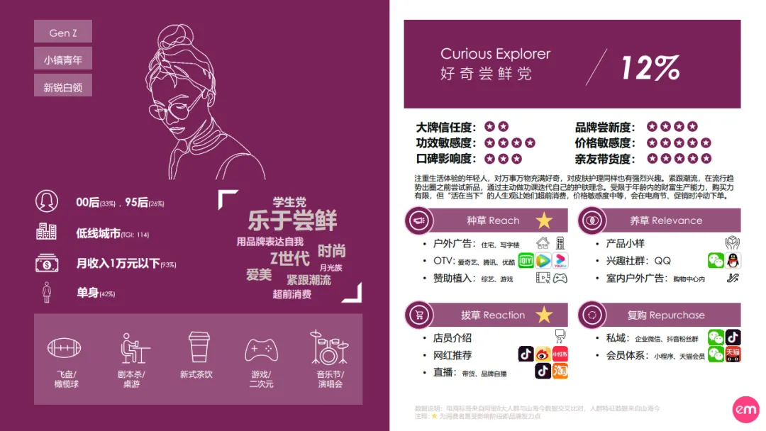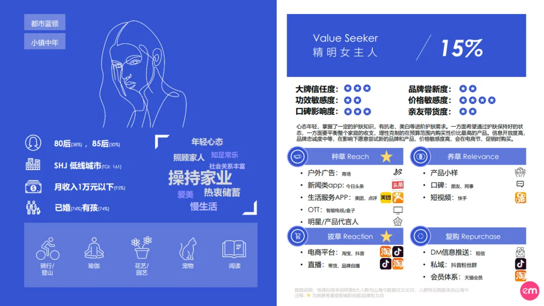 品牌可根据6类护肤消费人群选定1-3个主要目标人群,了解人群画像与兴趣触点,最后应用到具体每个平台制定不同营销策略抓住目标人群。