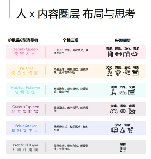 从内容圈层这点来说,护肤品6型消费者有着不同的兴趣圈层。可否在不同兴趣圈层中打入我们品牌的内容及相应有趣的活动来加深品牌印象入坑?