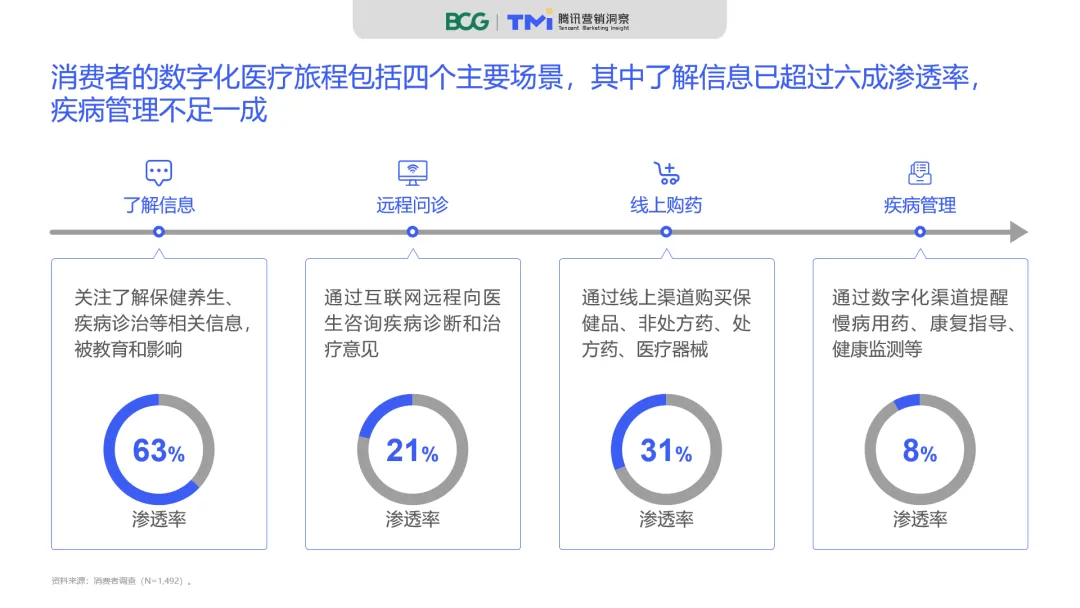 我们将消费者的数字化医疗旅程分为“了解信息”、“远程问诊”、“线上购药”、“疾病管理”四大主要场景。其中,了解信息已超过六成渗透率,疾病管理则不足一成。用户在不同场景中的主要诉求以及被满足程度会对渗透率有较大影响:互联网的“海量信息”和多样化的传播途径吸引多数用户通过线上了解医疗健康相关信息;远程问诊的便利性和灵活性满足了轻急症患者“节省时间、图方便”的需求;医药电商更多服务于消费者对保健品、非处方药和家用医疗器械的购买需求,处方药占比较少;线上疾病管理的认知度和效果暂时难以取代线下渠道,尚有诸多未满足的需求(参阅图4)。
