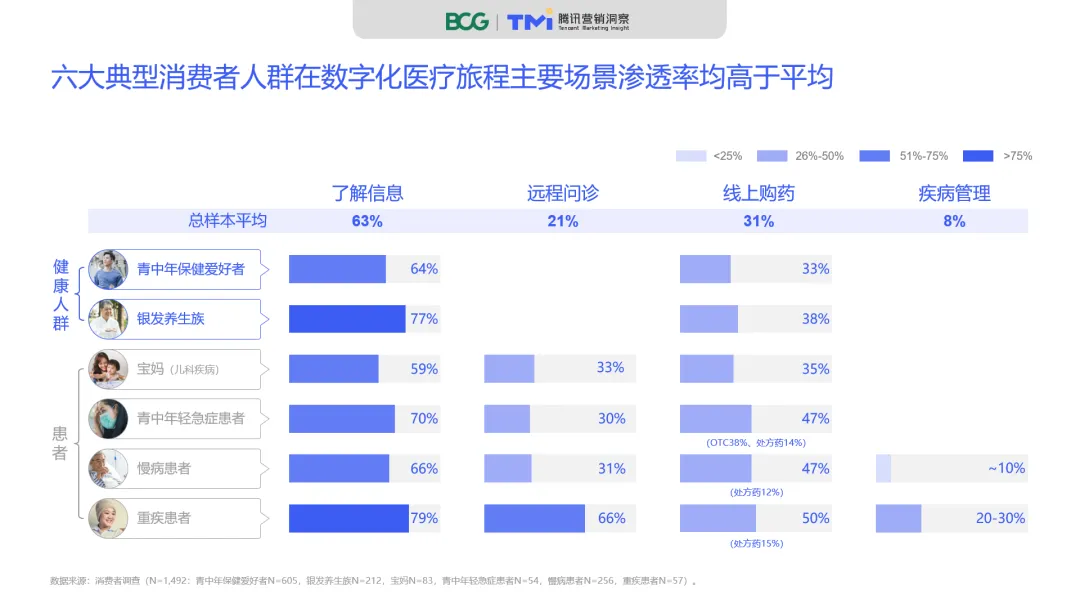 在各阶段场景下,不同年龄段及不同症状的患者在参与数字化医疗的进程中,行为方式也存在较大差异。其中六大典型消费人群——青中年保健爱好者、银发养生族、宝妈育娃群、青中年轻急症患者、慢病患者、重疾患者的场景渗透率均高于人群整体平均水平(参阅图6—7)。